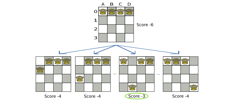A naive Local Search configuration solves the four queens problem in three steps, by evaluating only 37 possible solutions (three steps with 12 moves each + one starting solution), which is only a fraction of all 256 possible solutions. It solves 16 queens in 31 steps, by evaluating only 7441 out of 18446744073709551616 possible solutions. By using a Construction Heuristics phase first, it’s even a lot more efficient.